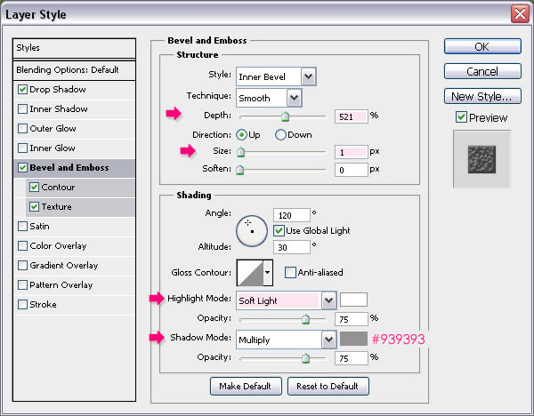 Bevel and Emboss: Change the Depth to 521, the Size to 1, the Highlight Mode to Soft Light, and the Shadow Mode color to #939393.